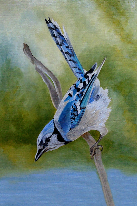 This painting is based on the original photograph 'Balance - Blue Jay', by Cindy Treger, whose express consent has been requested to use it as a reference.