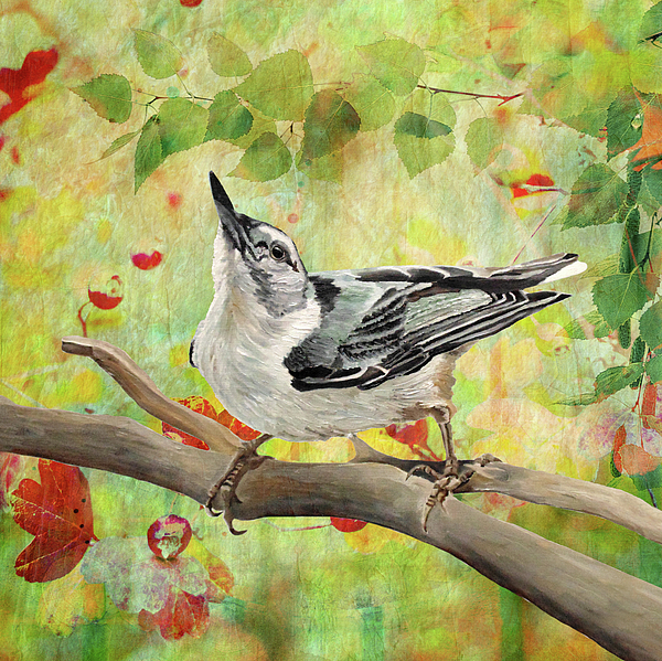 This painting is based on the original photograph 'Looking Up - White-breasted Nuthatch', by Cindy Treger, whose express consent has been requested to use it as a reference.