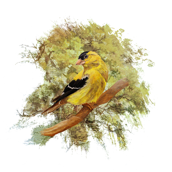 This painting is based on the original photograph 'Flawless Male American Goldfinch', by Cindy Treger, whose express consent has been requested to use it as a reference.