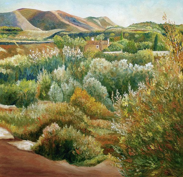 Angeles, what an amazing painting! Looks so peaceful with the colorful mountain scene and shrubs with the quite little house! Exceptional!