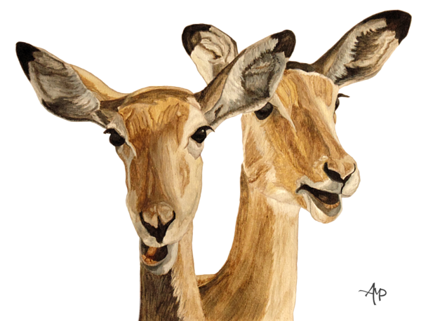 Two antelopes with expressive faces are depicted on a light background. Their attentive gazes and intricate fur details capture a lifelike quality.